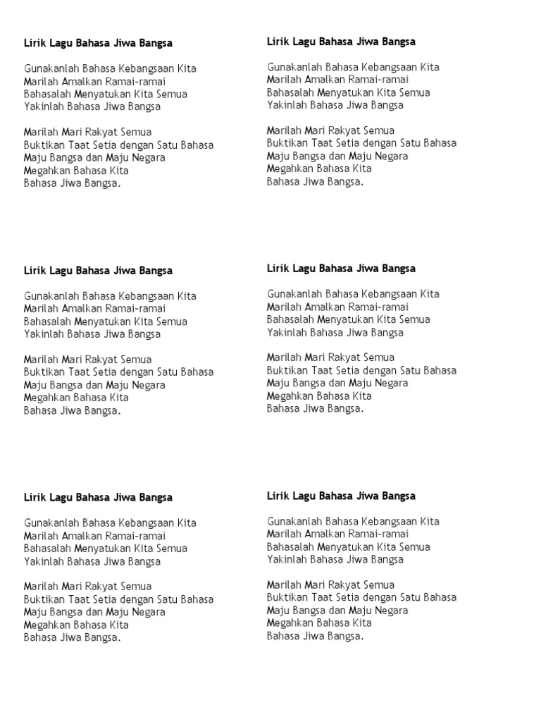 Bahasa Jiwa Bangsa Gunakanlah Bahasa Kebangsaan Kita Marilah Amalkan Ramai-ramai Bahasalah Menyatukan Kita Semua Yakinlah Bahasa Jiwa Bangsa Marilah Mari Rakyat Semua Buktikan Taat Setia dengan Satu Bahasa Maju Bangsa dan Maju Negara Megahkan Bahasa Kita Bahasa Jiwa Bangsa. Lirik Lagu Bahasa Jiwa Bangsa Gunakanlah Bahasa Kebangsaan Kita Marilah Amalkan Ramai-ramai Bahasalah Menyatukan Kita Semua Yakinlah Bahasa Jiwa Bangsa. Gunakanlah Bahasa Kebangsaan Kita.